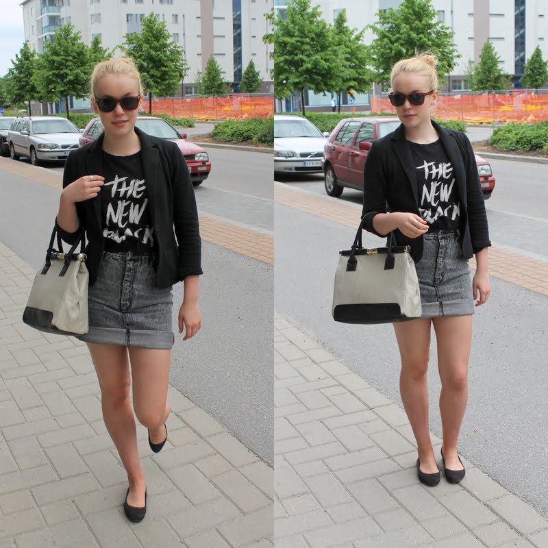 Päällä oli tänään aika perus farkut, t-paita ja tennarit yhdistelmää. Viimeistelin asun vielä mustalla bleiserillä. Mukana myös varmaan tästä eteenpäin vakkari aurinkolasit. Ihanaa lauantaita!